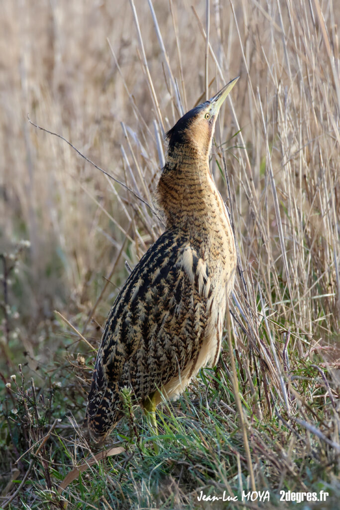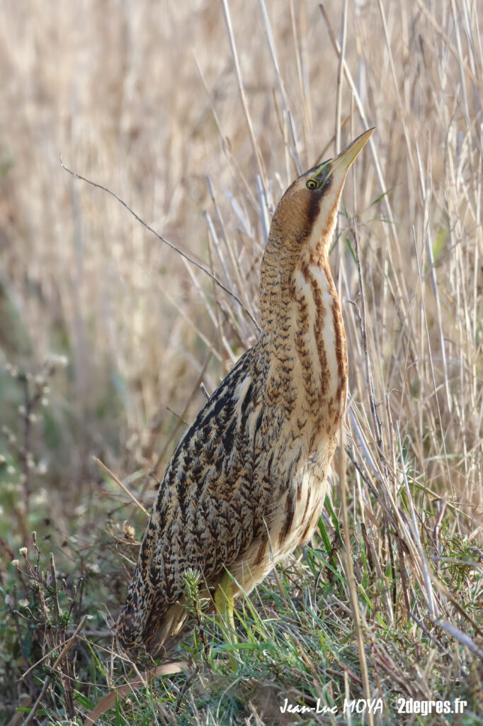 Quand il se sent observé, le butor adopte sa posture la plus célèbre : cou tendu, bec pointant vers le ciel, corps immobile qui semble prolonger les roseaux. Il se balance légèrement avec le vent, comme une tige de plus dans la roselière. Pour qui ne sait pas exactement où regarder, l’oiseau disparaît. C’est cette faculté à se fondre dans le décor qui lui vaut ses surnoms de « fantôme des marais » ou de « bœuf des marais ».