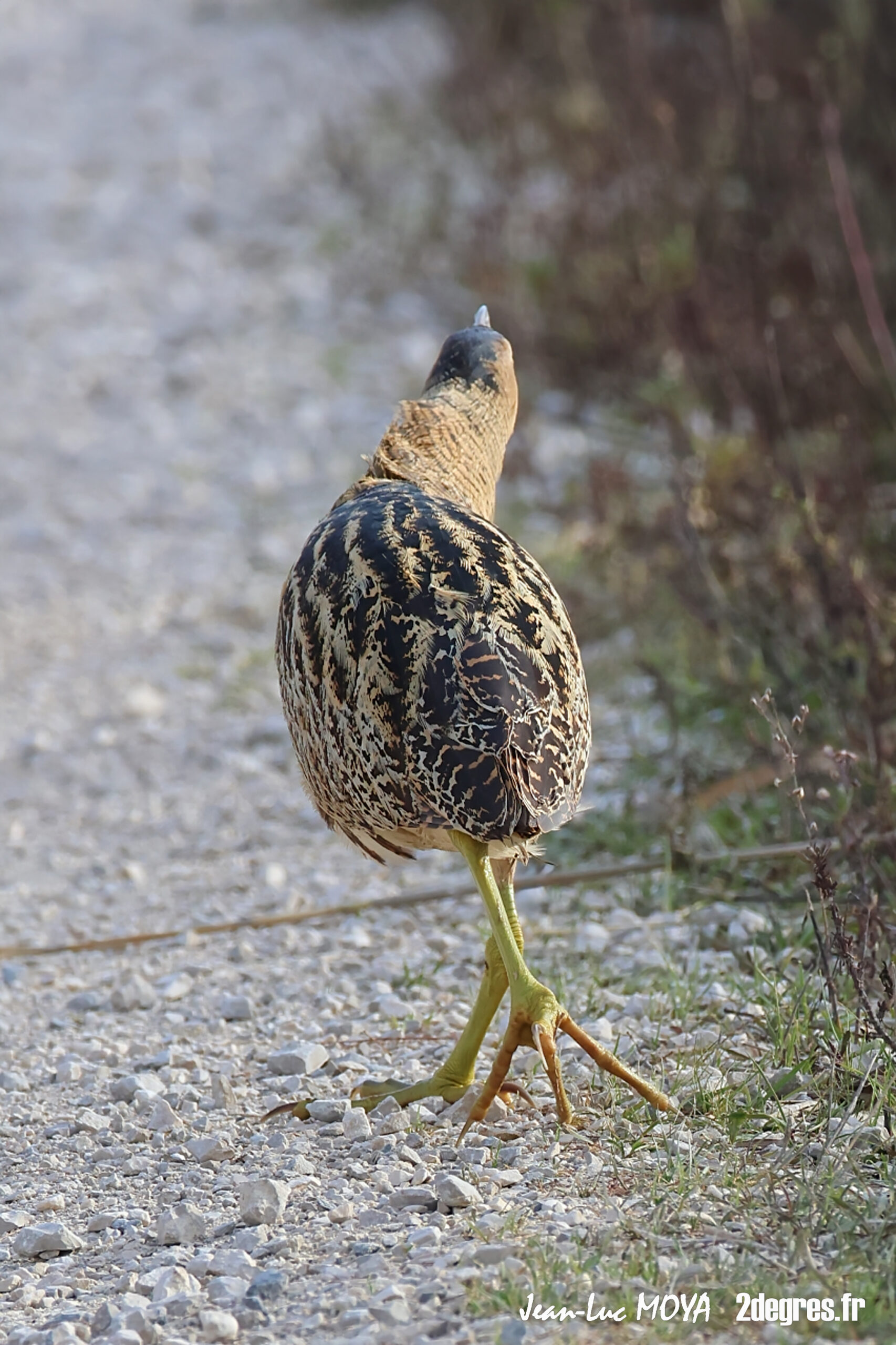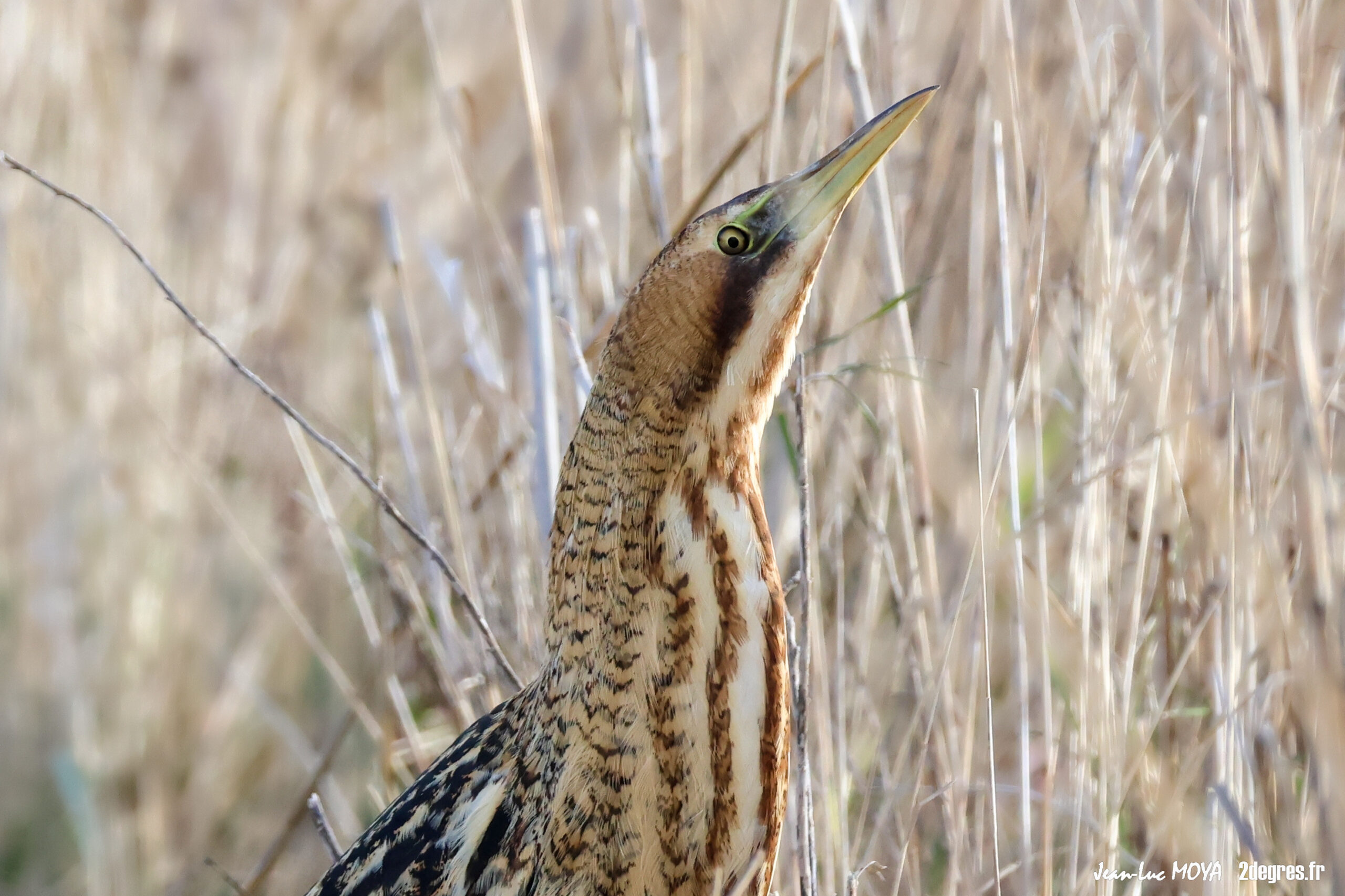 Quand il se sent observé, le butor adopte sa posture la plus célèbre : cou tendu, bec pointant vers le ciel, corps immobile qui semble prolonger les roseaux. Il se balance légèrement avec le vent, comme une tige de plus dans la roselière. Pour qui ne sait pas exactement où regarder, l’oiseau disparaît. C’est cette faculté à se fondre dans le décor qui lui vaut ses surnoms de « fantôme des marais » ou de « bœuf des marais ».